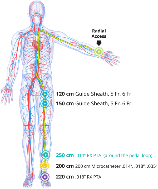 Crossing the pedal loop and up the contralateral tibial artery with the 250 cm Sublime™ Radial Access .014” RX PTA Dilatation Catheter